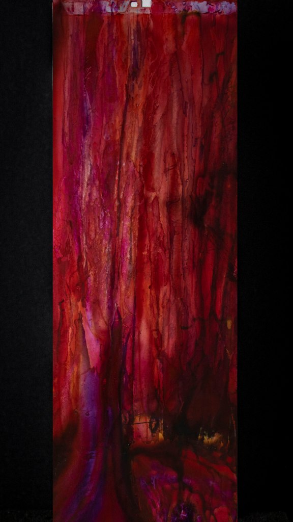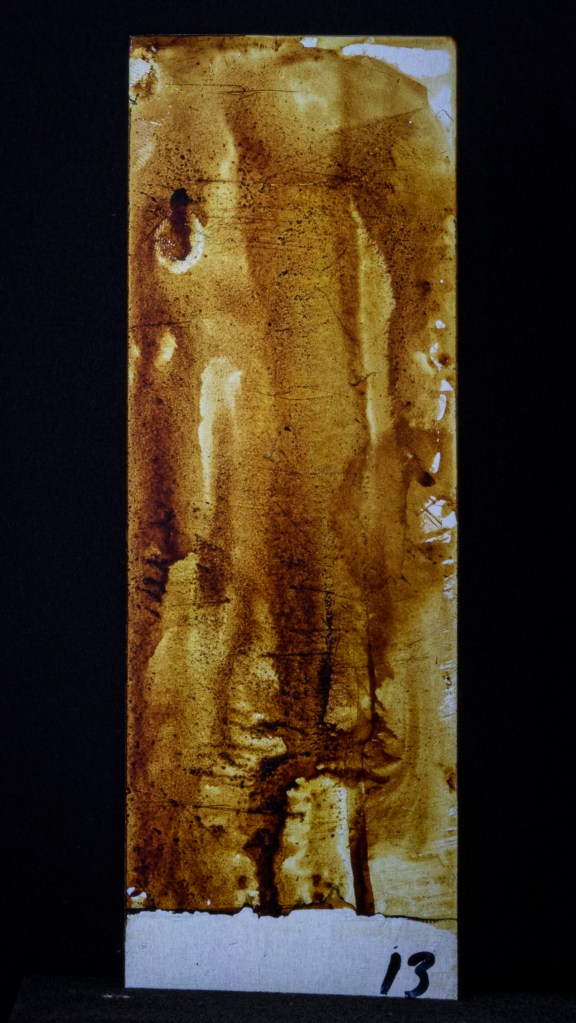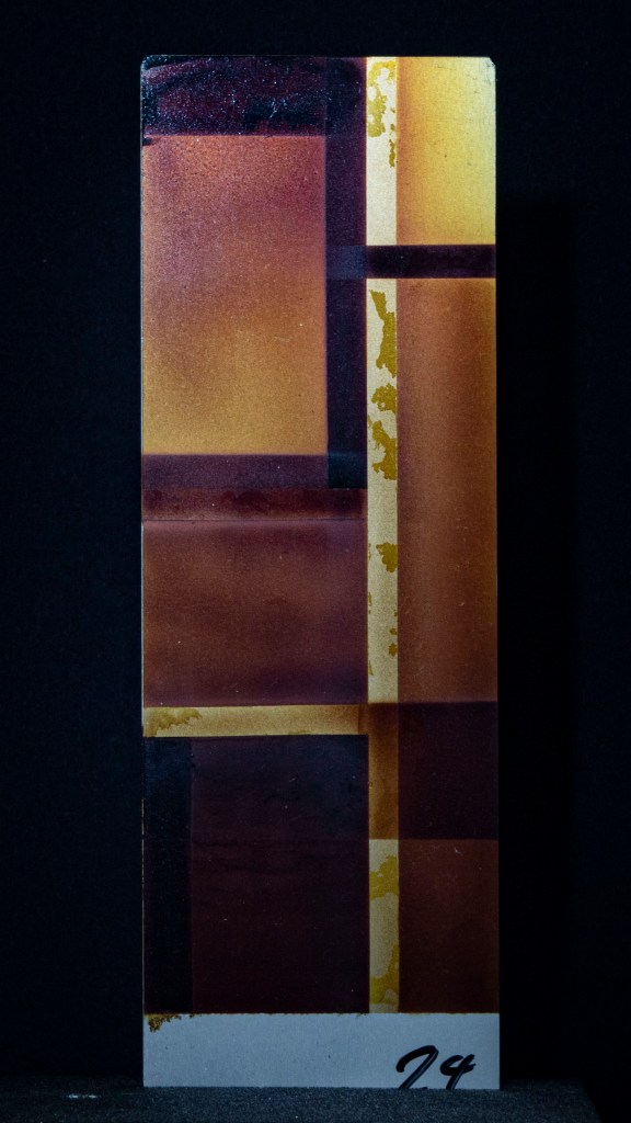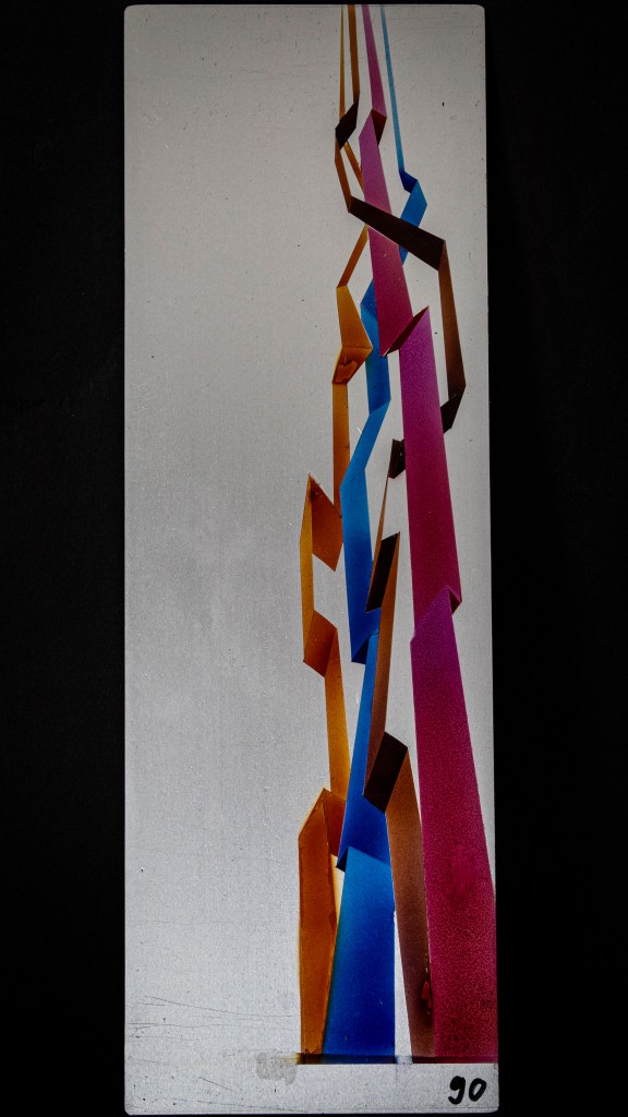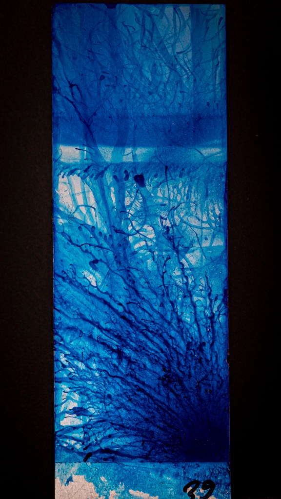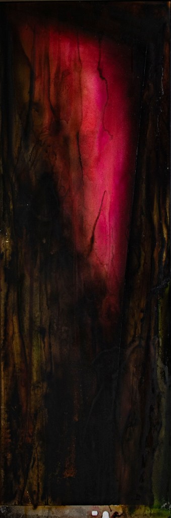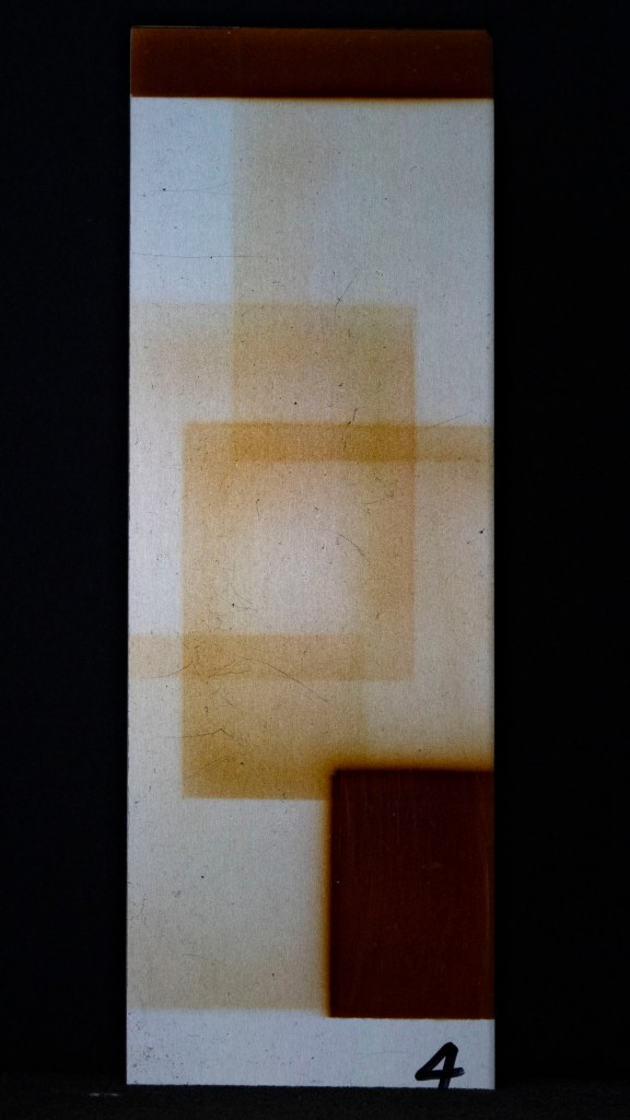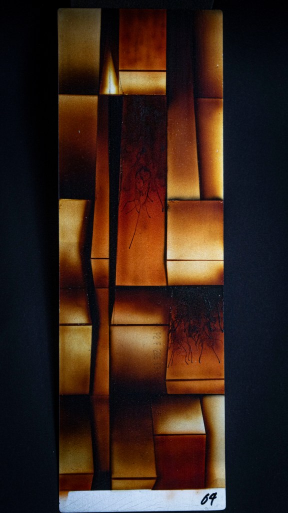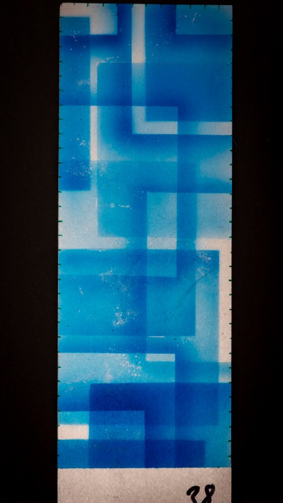 Aus ein paar Testversuchen zu dieser Ausgangslage wurde eine intensive, teilweise klärende Auseinandersetzung zwischen Transparenz, Form, Tiefe, Faltung, Raum, Auftrag, Abtrag, Lasierung, Lavinierung, Planung, Zufall, Unfall, aufwändiger Vollmaskierung und einfachstem Abklatsch.