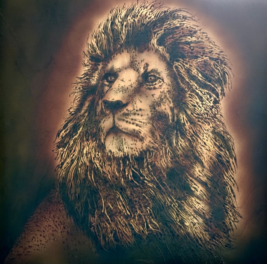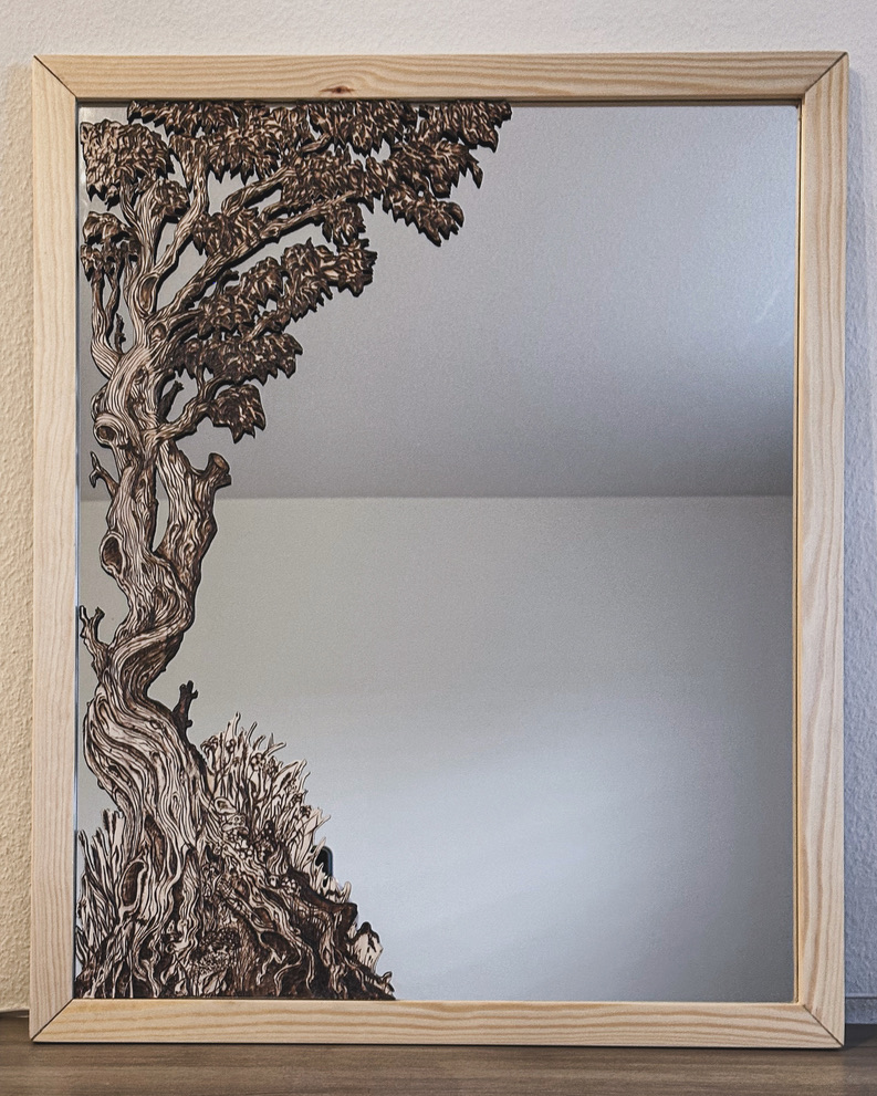 gerahmter Spiegel mit Brandmalerei-Einsatz (abnehmbar), Zeichnung Freihand