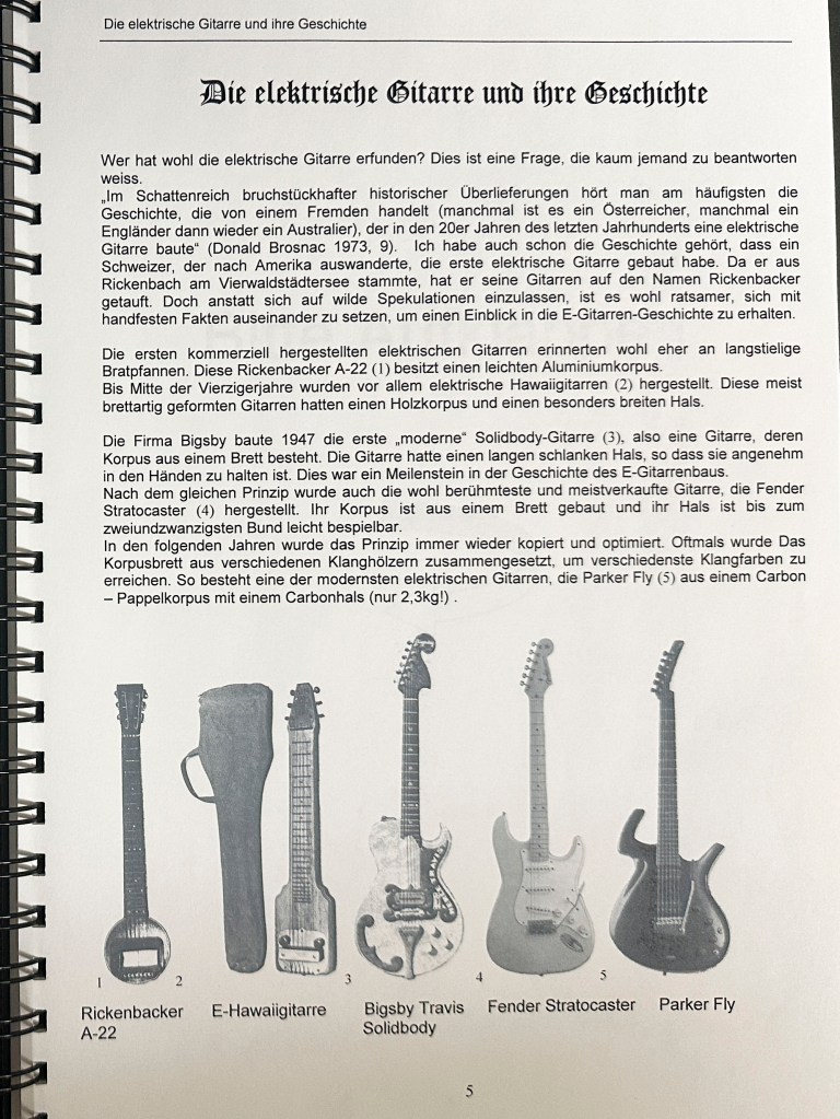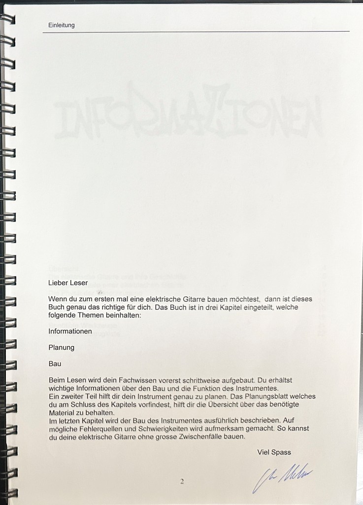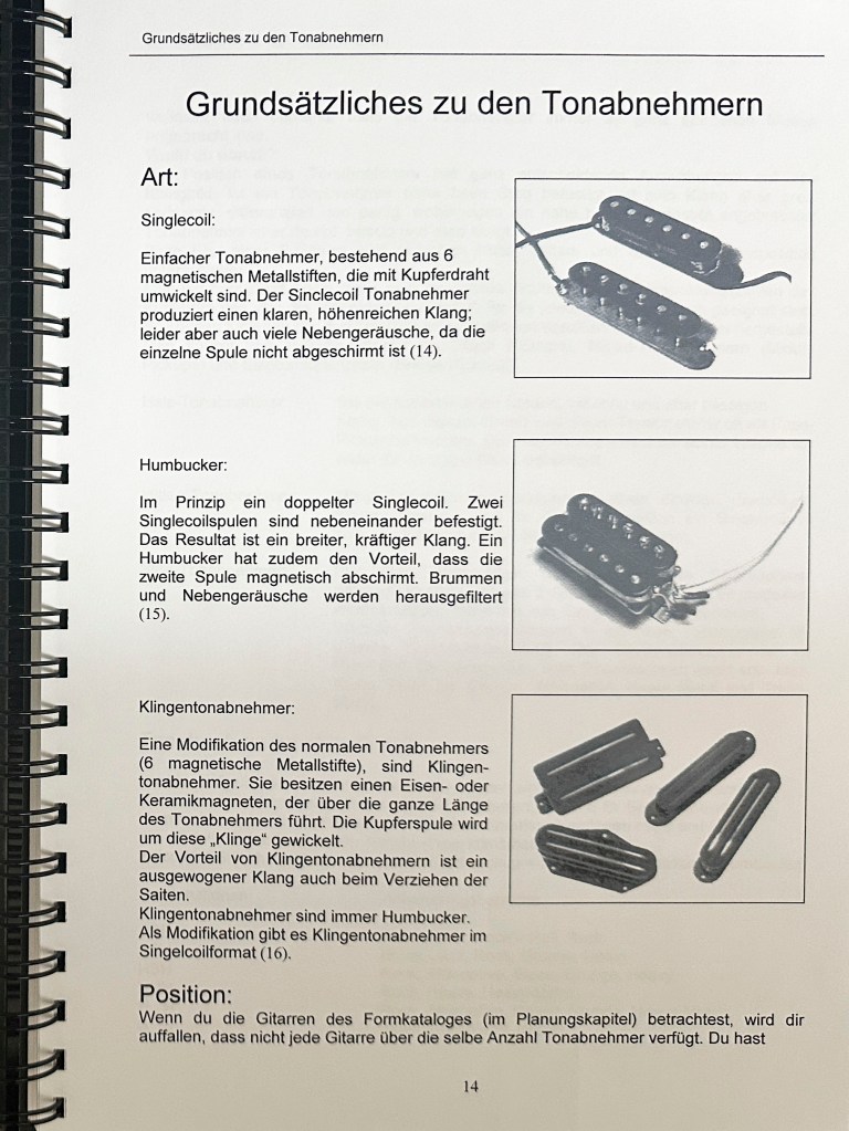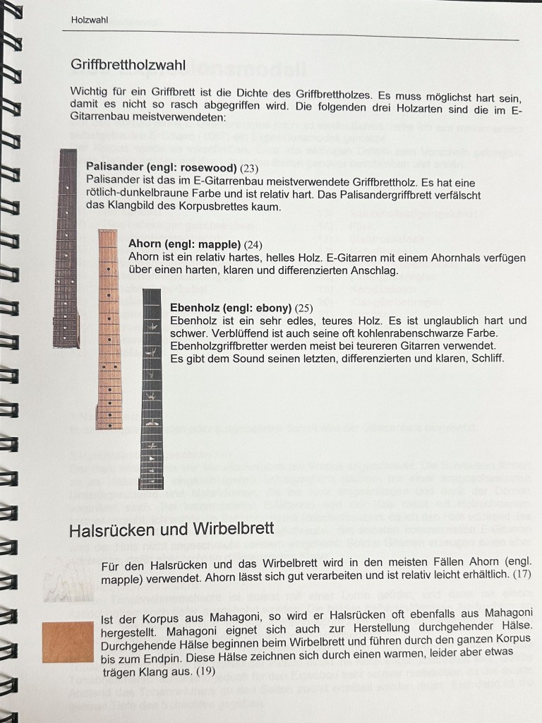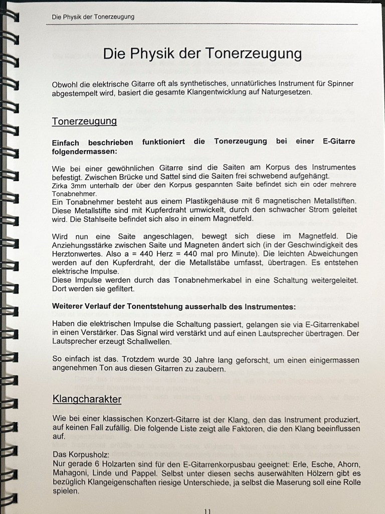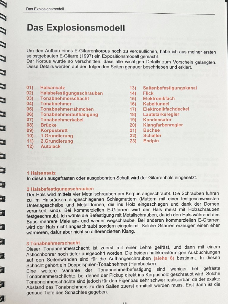 Die Ausbildung als Primarlehrer schloss ich mit dieser umfangreichen Diplomarbeit ab. Damals hatte ich mir schon ein grosses Wissen im Bereich Elektrischer Gitarren angeeignet und bereits 2 solcher Instrumente gebaut. Mit der Diplomarbeit wollte ich das vorhandene Wissen bündeln und Werklehrer:Innen und jugendliche DIY Enthusiast:Innen zugänglich machen.