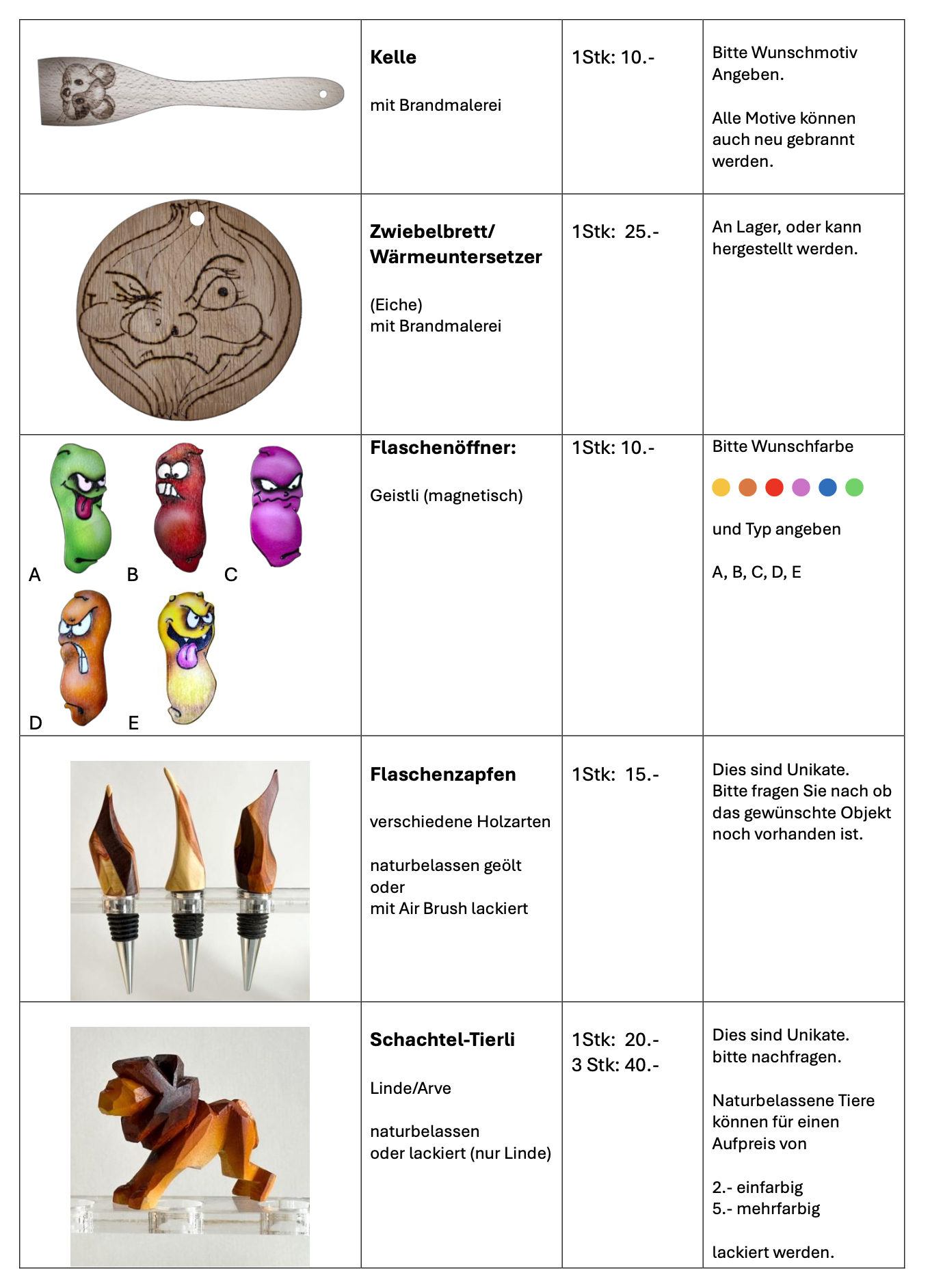 - Preise von Bildern, Werken und grossen Objekten richten sich nach Aufwand, Gelingen, persönlichem Bezug und Werkzugehörigkeit.