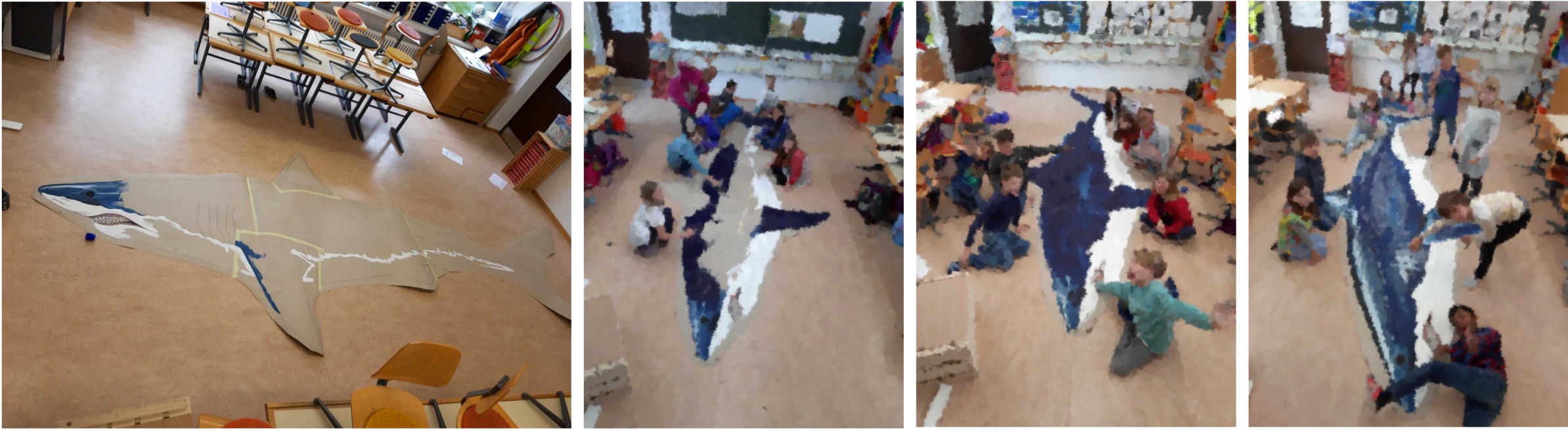 Im Primarschulunterricht realisierte ich mit einer 3. Klasse einen Weissen Hai in Lebensgrösse. Malmittel: Gouache & Neocolor (gebendet mit Korkzapfen).