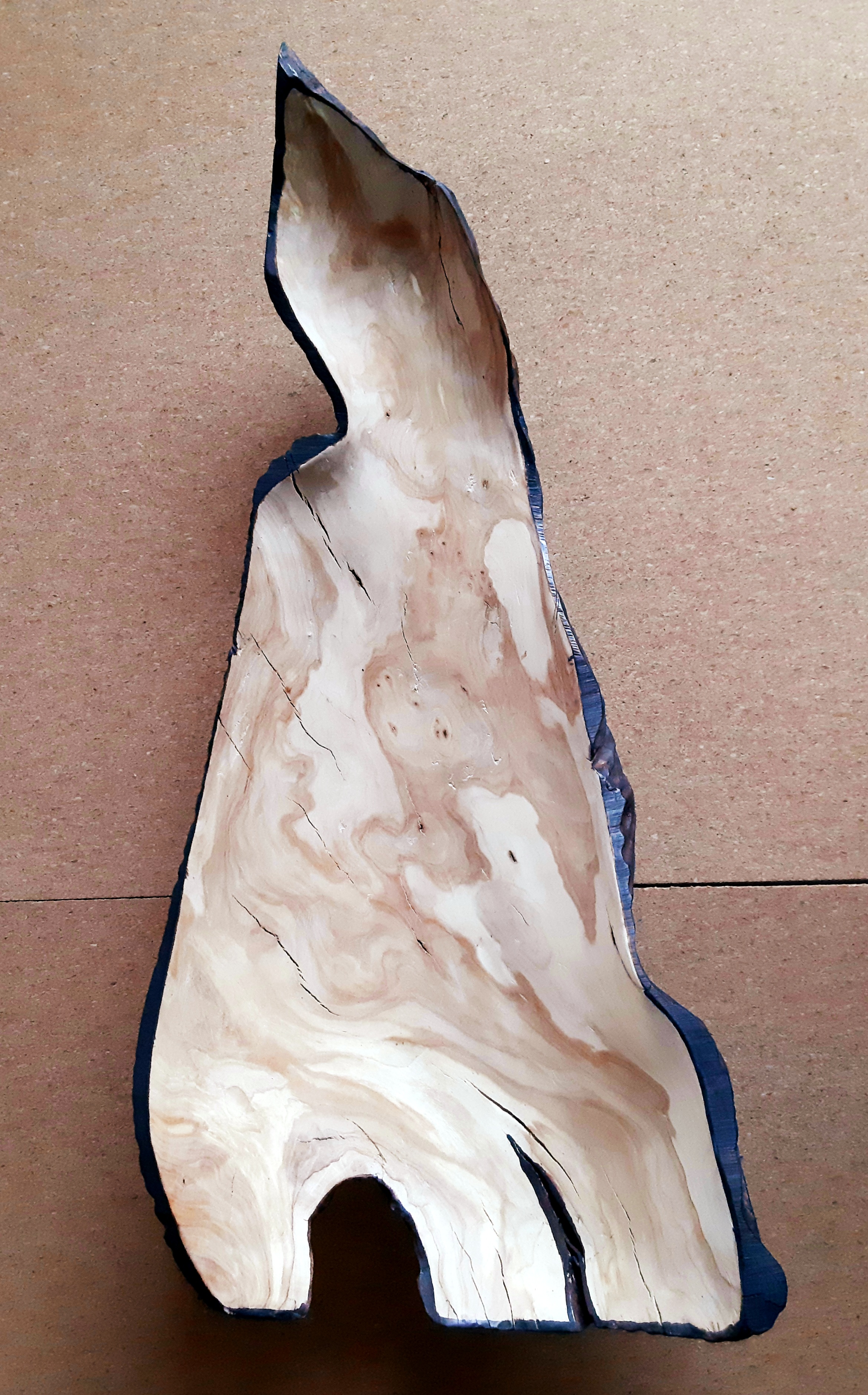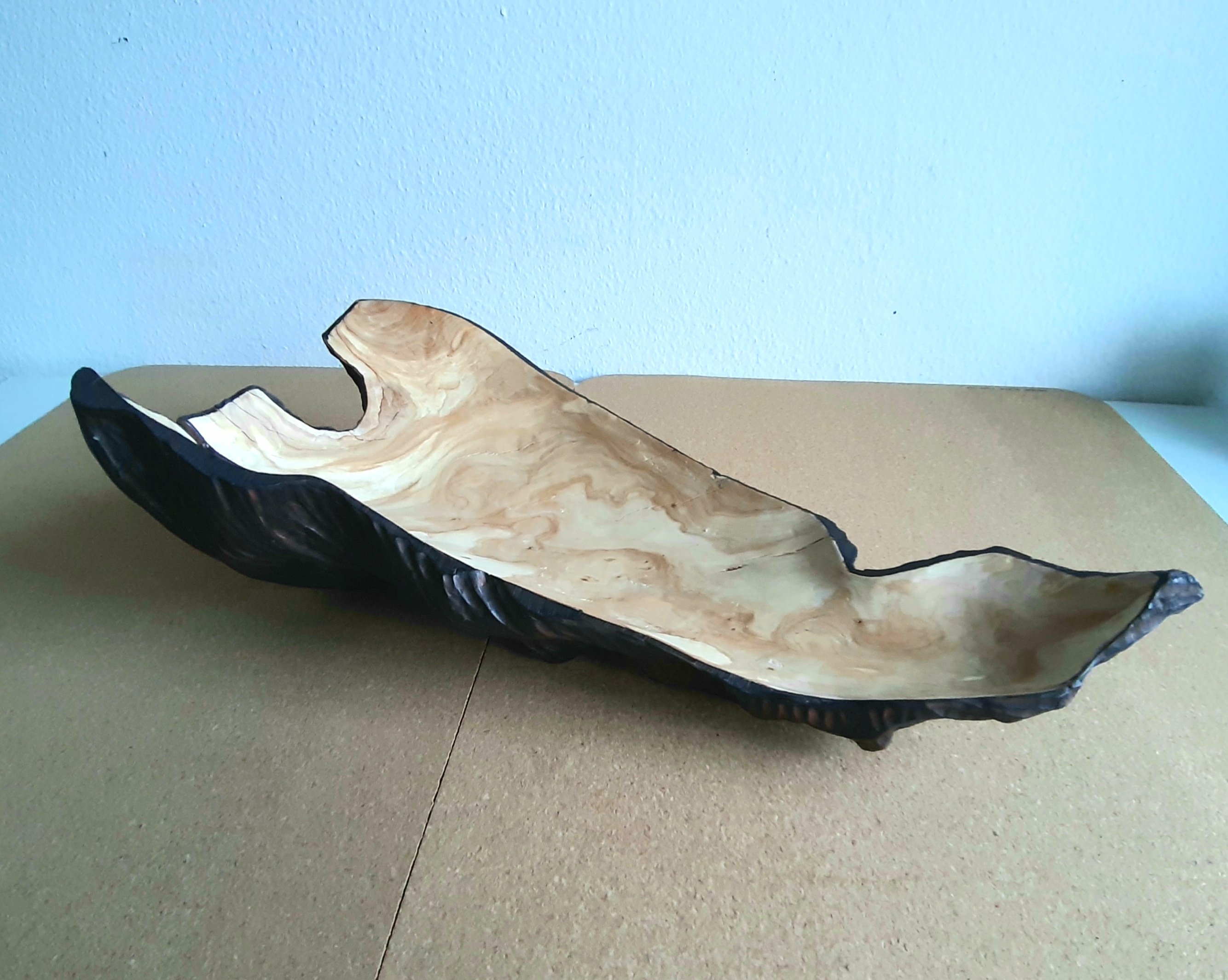 Die eigenwillige Form ist dem Lauf der Zeit geschuldet. Die Schale entstand aus einem alten, teilweise vermoderten Stück Holz.