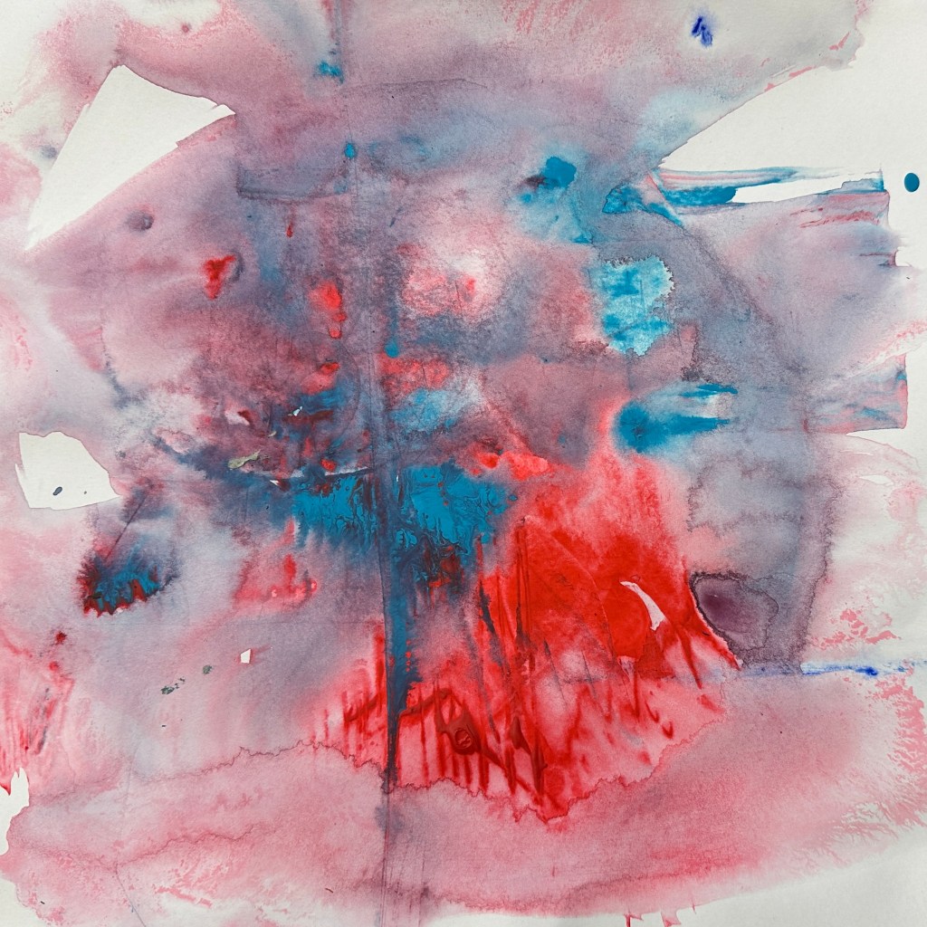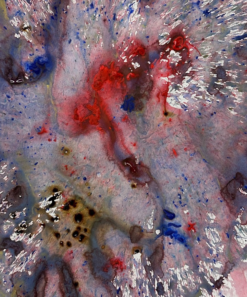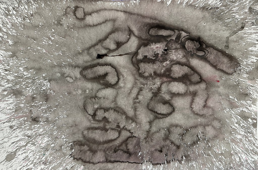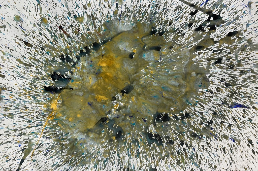 Mit 3D gezeichneten und ausgedruckten Kreiseln schufen wir in einer Papier-Arena die folgenden Bilder. Acrylfarbe und Tusche auf Papier, Formate A4-A2.
