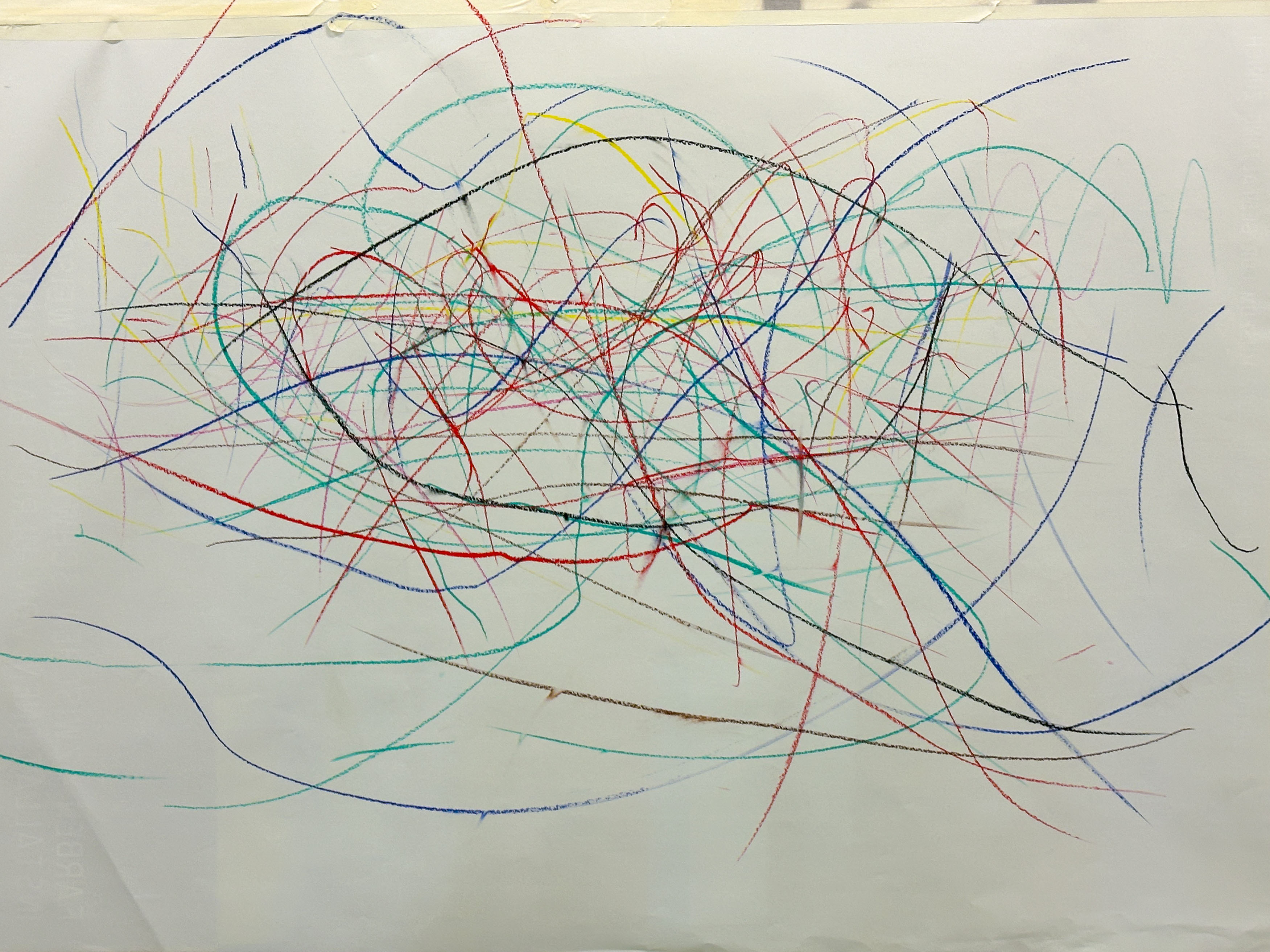Bewaffnet mit drei Stiften wird an einem Blatt vorbeigeschrammt, oder dieses frontal angegriffen. Wachskreide auf Papier.